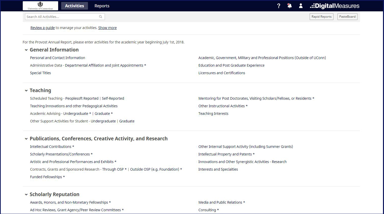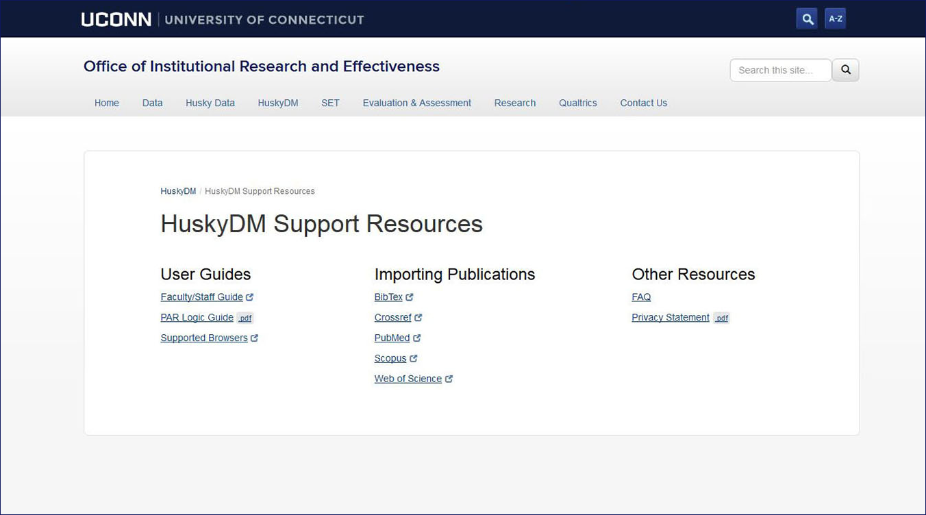 Welcome to HuskyDM, the data repository and reporting tool for UConn faculty. Here faculty can document their university-related activities throughout the year and generate the Provost Annual Report (PAR), as well as other university required reports.